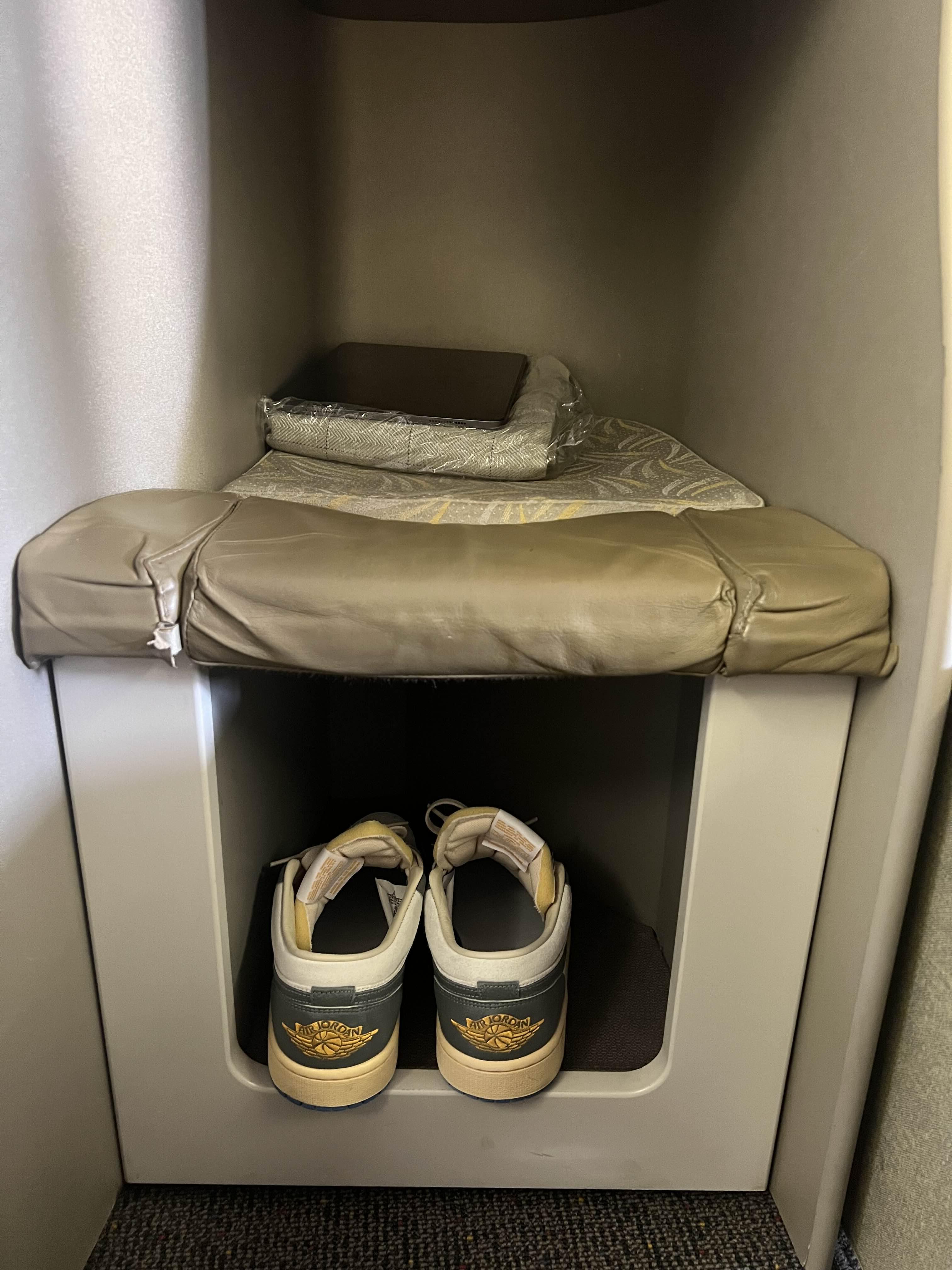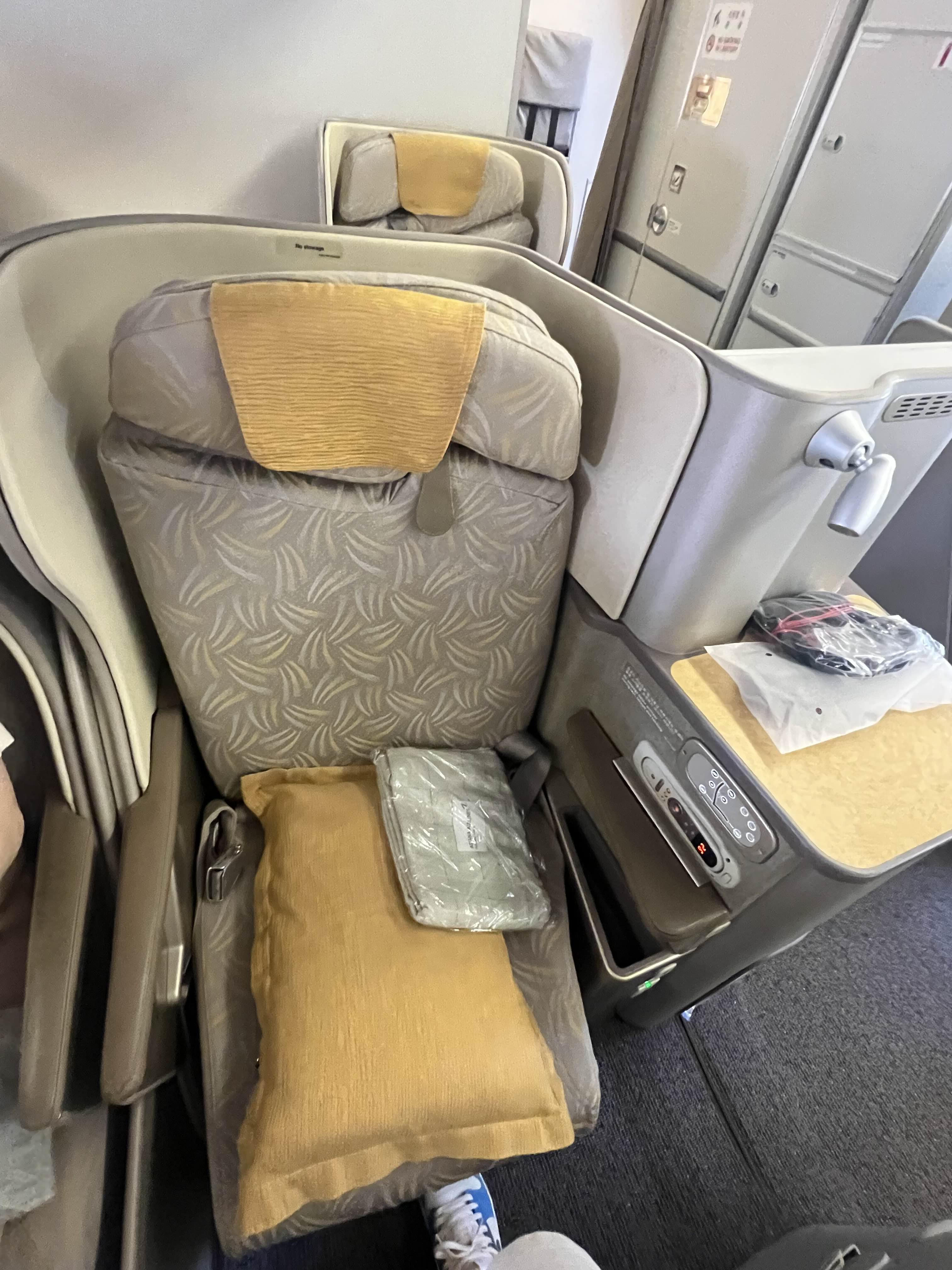 내자리로 가보니 담요, 헤드셋, 실내화, 배게가 있었어