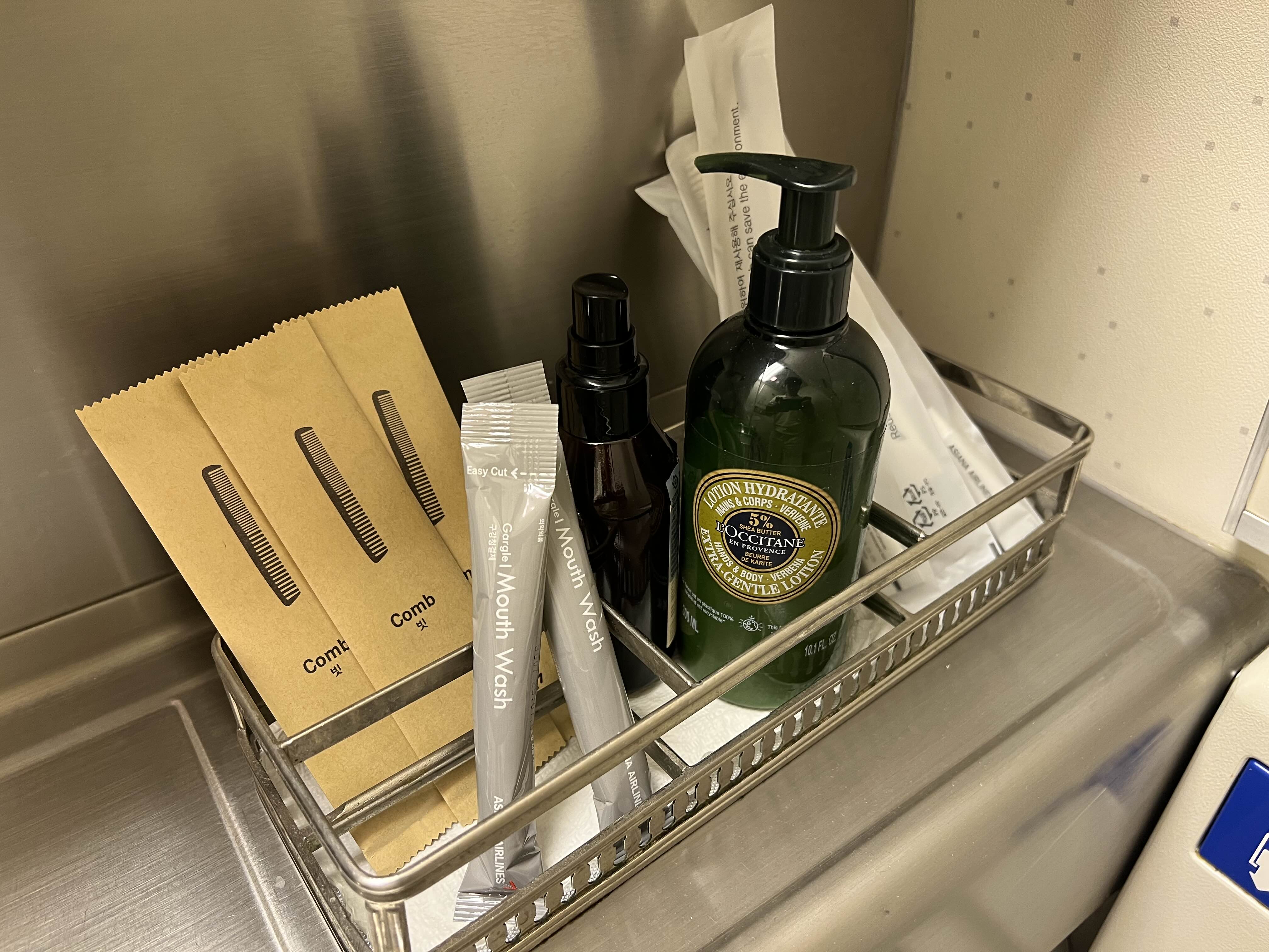 화장실 안에는 가글, 빗, 치약, 칫솔, 핸드크림, 미스트가 구비되어 있어